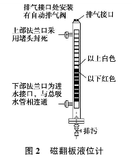 針對壓力變送器測量尾水管水位時,測量值產生誤差的缺陷,對壓力變送器的動作條件以及現場的實際情況進行了初步分析,認為利用連通器的原理,在總吸水管上面安裝一套浮子式的水位開關,這樣既能直觀地反映實時水位,又能保證水泵的安全、可靠運行,浮子開關的位置可以根據實際的工作水位進行布置,利用浮子的開關量去控制水泵的正常啟停。經查找多方面的資料以及咨詢相關設備的廠家后,決定對檢修排水系統增加一套水位測量裝置,具體方案為:在水泵的總吸水管上面安裝一套頂裝式磁翻板液位計,如圖2所示。