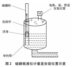 圖2中,B點靠近電機和泵,耐高溫磁翻板液位計安裝在此處既影響電機及泵的檢修,又因泵附近液位的環(huán)流波動較大,對浮子導向管沖刷嚴重,故B點不合理;C點處因有管道通過,不便維護且影響管道和泵、電機等的起吊更換,故也不能選擇C點;A點遠離泵和電機,且有足夠的空間安裝翻板,便于維護,所以A點較為合適。