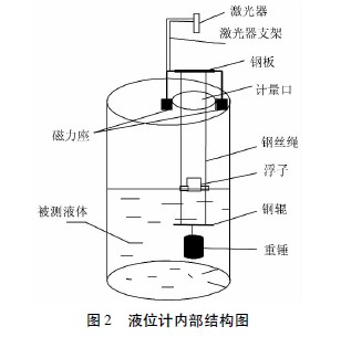 鋼絲繩用作浮子的導(dǎo)軌,鋼絲繩的上端用鋼板來(lái)固定,鋼板中間開(kāi)了一個(gè)和激光器筒直徑大小一致的圓孔,以便激光的發(fā)射和接收。鋼輥和重錘用來(lái)固定鋼絲繩的下端。