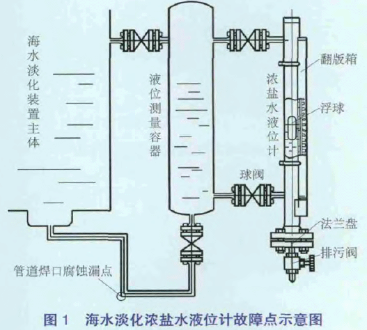 2013年12月16日0:20海淡水化裝置主體U3濃鹽水液位計開始出現30%~70%的波動,檢查液位計本體無異常,將液位計上、下閥門關小后,液位測量波動減小,但故障現象并未消失。利用高爐休風機會降海水淡化U3 主體負荷并查找故障原因。將液位計上、下閥門全關閉并拆下下部絲堵,打開排污閥徹底進行排氣排污處理,檢測磁性浮子,未發現異常。當投運后波動現象存在。濃鹽水液位計更換后再次試投運,發現液位計液位顯示波動更大、更頻繁。經過排查發現與液位測量容器(見圖1)連接的管道焊接處有漏點,對該漏點進行封堵后液位測量顯示恢復穩定,負荷狀態生產恢復正常。