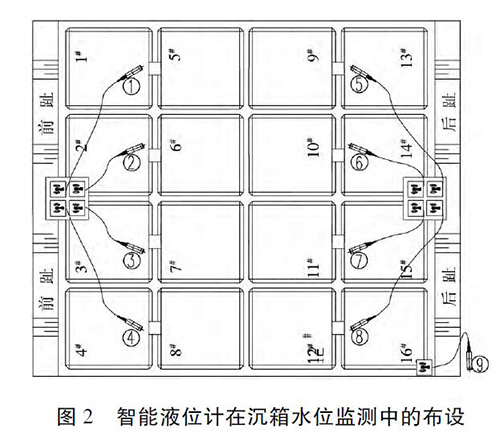 為了避免在沉箱頂部現場布線和減少高空作業時間,沉箱水位監測擬采用無線傳輸方式,頂裝型磁翻板液位計采集的沉箱水位數據信號通過無線發射和無線接收的方式,傳輸到電腦進行數據處理后,在屏幕上直觀顯示出大型沉箱不同格倉水位和倉外吃水深度。一個MPM4700 型頂裝型磁翻板液位計對應一個獨立的無線發射單元,根據所監測的沉箱格倉數量來確定無線發射單元的數量。每個無線發射單元包括卷線盤、MPM4700 型頂裝型磁翻板液位計、485 轉換器、無線發射器、無線發射天線、移動電源等;無線接收單元與筆記本電腦相連接,包括無線接收器、無線接收天線、移動電源。無線發射器和發射天線固定在卷線盤上,攜帶輕便,在沉箱出運施工平臺吊裝時,卷線盤綁扎在施工平臺的人行通道旁,隨施工平臺吊升到沉箱頂部; 需要監測時施工人員通過卷線盤放線,頂裝型磁翻板液位計探頭放入到沉箱格倉底部,打開無線發射單元的移動電源即可。以漳州后石港區3 號泊位工程沉箱為例,該工程沉箱為16 個格倉,沿前趾和后趾方向的相鄰2 個格倉設置通水孔相互連通。因此,通過監測沉箱前趾4 個格倉和后趾4 個格倉的水位,就可以掌握整個沉箱的平衡狀態。在沉箱水位監測時,總共布設9 個MPM4700 型頂裝型磁翻板液位計,平行前趾或平行后趾4 個格倉分別布設4 個液位計,1個液位計放在格倉外與沉箱底齊平以監測半潛駁下潛時沉箱的吃水深度( 圖2) 。