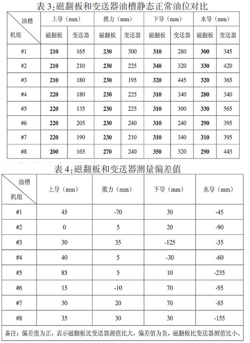 從表3,可以看出磁翻板油槽油位與監控變送器測量值存在偏差,具體偏差值見表4: