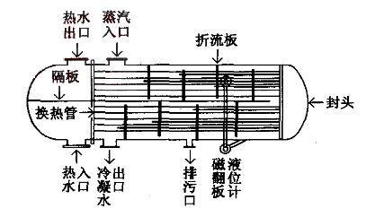 如下圖所示,壓力為0.4~0.6MPa的飽和蒸汽由蒸汽入口進(jìn)入管式換熱器,經(jīng)折流板、隔板上下流通,*終其大部分熱量被熱水吸收,形成凝結(jié)水從凝結(jié)水出口流出。一次熱水(溫度約為20℃)從熱水入口流進(jìn),經(jīng)過從左向右的換熱管流至封頭,在經(jīng)過從右向左的換熱管從熱水出口流出,變成二次熱水,二次熱水流向系統(tǒng),放熱后流回?fù)Q熱站循環(huán)水泵入口,經(jīng)加壓后再次流向熱水入口,如此反復(fù)循環(huán)加熱,*終向用戶提供80~130℃的高溫?zé)崴?/div>