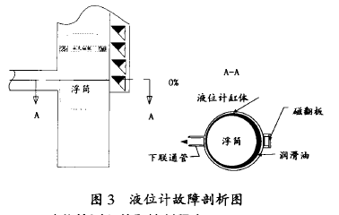 持續(xù)向空貯罐加油至液位計(jì)指示值37%時(shí),用時(shí)約15min。反之,排油液位計(jì)回零用時(shí)大于40min。在其它區(qū)域液位變化則快許多。通過對粗苯防爆液位計(jì)結(jié)構(gòu)分析,我們發(fā)現(xiàn):圓柱體浮筒(~58mm×280mm)浮在0% ~37%區(qū)間時(shí),形同一個(gè)柱塞擋住了液位計(jì)簡體下部的聯(lián)通管管口(見圖3,