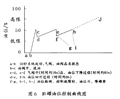 當(dāng)檢測到油位低*限位開關(guān)信號(油位標(biāo)尺的20%處,LB/LVL6動(dòng)作)時(shí),開始計(jì)時(shí),氣閥在45s內(nèi)處在關(guān)閉狀態(tài),使罐內(nèi)油位上升。油位低信號解除后,進(jìn)入正常工作油位控制程序。若45s后油位低信號仍然存在,則執(zhí)行油位低故障處理程序。