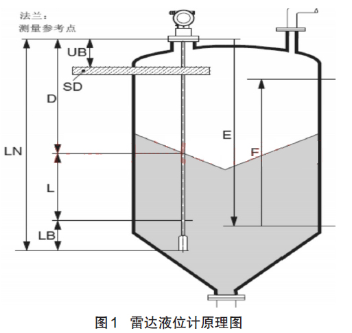 式中:D為雷達(dá)液位計(jì)到液面的距離;C為電磁波的速度;T為電磁波在發(fā)射-發(fā)射-接收過(guò)程中運(yùn)行的時(shí)間,其雷達(dá)液位計(jì)的超高速計(jì)時(shí)電路可以精確地測(cè)量出電磁波傳導(dǎo)經(jīng)歷的時(shí)間,而電磁波的傳輸速度C為常數(shù),即可計(jì)算出液面到雷達(dá)天線的距離D,從而知道液面的液位L=E-D,雷達(dá)液位計(jì)的測(cè)量原理如圖1。