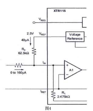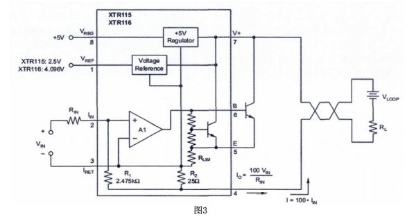 把傳感器輸出的不同電壓轉換成標準的4-20ma輸出,可采用不同的電路形式。成本低的可采用分立器件,但是為了達到比較高的精度,要保證相應器件的匹配程度,調試也比較麻煩。TI公司推出的XTR 系列工業(yè)傳感器專用的4-20ma的一體化變送器集成電路,采用該系列產品設計的變送器成本低,精度高,調試簡單。經過選擇決定使用XTR115完成設計。內部結構如圖三:
