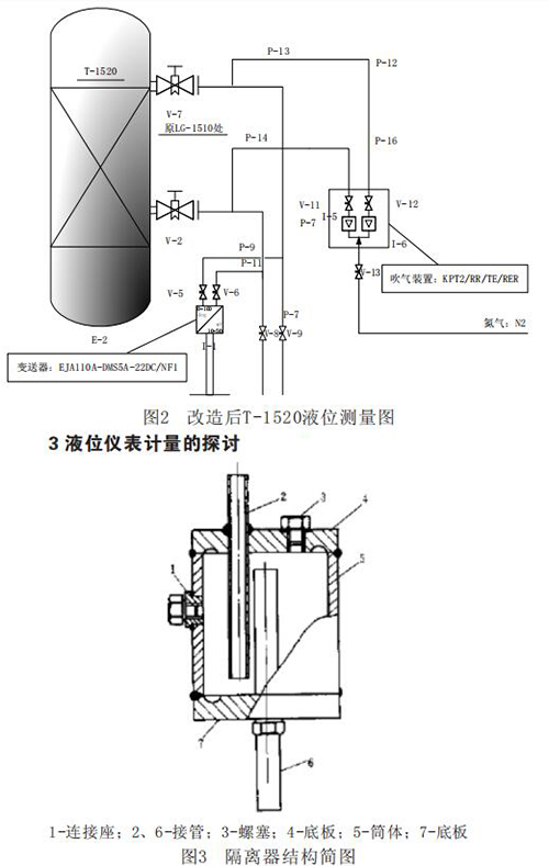 對溶劑吸收工段吸收塔T-1520進(jìn)行儀表改造,拆除原就地電遠(yuǎn)傳磁翻板液位計(jì),在原就地液位計(jì)處增加一套反吹法測量設(shè)備。增加的儀表有:普通磁性浮子液位計(jì)1臺:EJA110A-DMS5A-22DC/NF1、反吹風(fēng)裝置1套、球閥(DN10)3只,¢14不銹鋼管等。圖2為技術(shù)改造后的反吹法測量液位的安裝效果圖。
