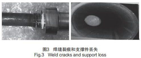 在歷次大修執行 GSS 系統 MSR 熱水箱液位計預防性維修檢查時發現,部分導波桿支撐件破碎并丟失,同時存在探桿根部焊縫有裂痕的問題,見圖 3 焊縫裂痕和支撐件丟失。