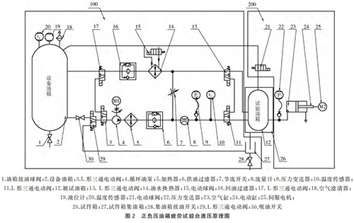 (1)循環油液控制回路,如圖2中100部分。這個部分主要由“保溫油箱、液位計、過濾器、循環油泵、加熱器、流量計、電動三通閥、油水換熱器、液體液位計、溫度傳感器等組成”;被試油箱滑油供回油口連接在試件箱內供油軟管和回油軟管之間,即可對被試油箱內部油液流動要求及溫度進行控制。