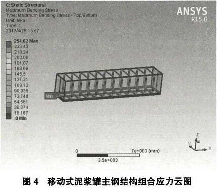 (2)考慮在使用過程中,可能出現(xiàn)兩個(gè)滿載的相同泥漿罐疊放的*端工況,因此底部泥漿罐在滿載的情況下還要承受上部相同尺寸的滿載泥漿罐的自重。將上部滿載泥漿罐的自重等效為加載在下部泥漿罐頂結(jié)構(gòu)的均布壓力其中,見為滿載泥漿槽自重,識=168782x9.81=1655752為儲存罐頂部方管的長度乂=29.丨8111。因此/^56.8犯11?。