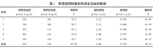(1) 技改原理: 新樹脂入廠檢驗(yàn),飽和樹脂容量可以達(dá)到 2. 5 ~ 2. 8g /L。但在實(shí)際生產(chǎn)中由于含液位計(jì)母液的通過(guò)量不足,造成樹脂的吸附率較低,新樹脂飽和樹脂容量一般在 2. 0 ~ 2. 2g /L 之間。通過(guò)再增加一組吸附塔來(lái)進(jìn)行雙塔吸附,即提高了樹脂利用率,又充分利用了母液,提高樹脂的飽和度。采用雙塔交叉吸附工藝的升級(jí)改造,是在原有單塔吸附的基礎(chǔ)上增加一個(gè)吸附塔和一臺(tái)母液進(jìn)塔泵。兩臺(tái)母液進(jìn)塔泵分別向兩個(gè)吸附塔同時(shí)供液樹脂吸附飽和后,兩個(gè)吸附塔樹脂交叉進(jìn)行下步解吸工藝。表 1為單塔吸附工藝生產(chǎn)中取用的一組數(shù)。