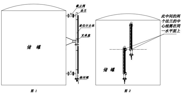 (9)對于超長型磁翻板液位計(jì)(測量范圍大于4m),物流運(yùn)輸成本較高,一般進(jìn)行分段制作。分段方法有以下兩種形式,可根據(jù)客戶現(xiàn)場設(shè)備的實(shí)際接口形式而定。圖1形式是將一臺磁翻板液位計(jì)分成兩段,安裝時(shí)先組裝對接好連接法蘭,在進(jìn)行對接操作時(shí)可適當(dāng)松開顯示面板,支承點(diǎn)的數(shù)量根據(jù)磁翻板液位計(jì)的長短來定。圖2形式是分成兩臺或若干臺獨(dú)立的磁翻板液位計(jì),這種形式的結(jié)構(gòu)要求儲罐中間的兩塊法蘭的中心線處在同一水平面上,以實(shí)現(xiàn)液位顯示的連續(xù)性。