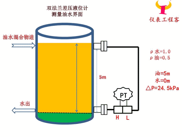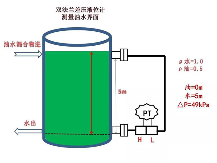 水的密度為1.0,油的密度為0.5,變送器的硅油密度為0.93,測量范圍5m,求油面在5m時變送器的差壓值。
