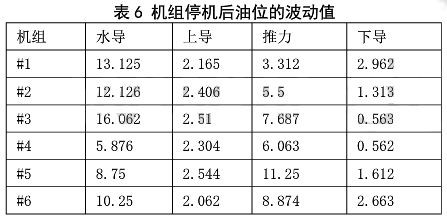 小結:在機組停機后各部軸油箱油位有波動,主要原因是油箱內部的靜態自平衡,還有傳感器的測量數值波動影響,故存在一定范圍的數據波動。6 臺機的各部軸承油位波動范圍沒有相同的規律。