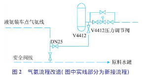 1)將液氨裝車氣氨返回線由進酸性水中間罐改為進氨氣分液罐V4412。以前,氣氨返回線至酸性水中間罐,由于液氨裝車時有大量氣氨返回原料水中間罐,氣氨不能及時吸收、溶解,造成原料水中間罐(V4410或V5407)壓力上升,水封被破壞,罐內氣體外逸,形成安全環保隱患。為減少原料水罐氣氨返回量,在大檢修期間,增加了氣氨至V4412入口管線流程(氨壓機入口)。具體流程見圖2。