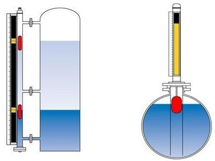 液位計根據浮力原理,浮子在測量管內隨液位的升降而上下移動,浮子內的永久磁鋼通過磁耦合作用,驅動紅、白色翻柱翻轉180’液位上升時,翻柱由白色轉為紅色,下降時,翻柱由紅色轉為白色,從而實現液位的指示。