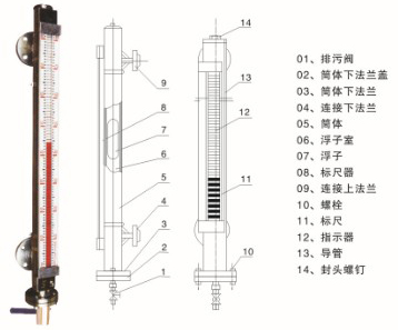UHZ系列磁翻板液位計主要用于石油、化工、煉油、醫藥、食品、酒業、飲料等行業中各類儲液罐、分離罐、反應罐、發酵罐內液體、油品、液化氣、強酸堿液、弱酸堿液、發電廠鍋爐汽包、除氧器、疏水箱、回水箱、高低壓加熱器、凝結器、蒸發器及其他壓力容器內與1Cr18Ni9Ti 、316L。1Cr18Ni9Ti+PTFE(內襯聚四氟乙烯)及與PVC塑料相容的介質的液位測量與顯示、多點液位開關輸出、電遠傳(4~20mA、0~10mA DC)輸出。安裝形式有標準型、頂裝型、浮球液位計、保溫型、防霜型等供您選擇使用。工作原理及基本結構 UHZ 系列液位計是根據浮力和磁性原理,利用測量筒內磁性浮子隨被測液面的升高或降低,通過磁場的吸引力,使測量筒外部顯示器上的雙色翻柱隨之翻轉實現了顯示被測液面位置的目的。磁翻板液位計以紅色來指示液體部分,以白色來指示無液或汽體部分,也可選擇白色表示液體部分紅色表示無液或汽體部分。